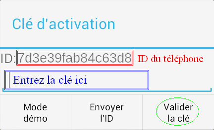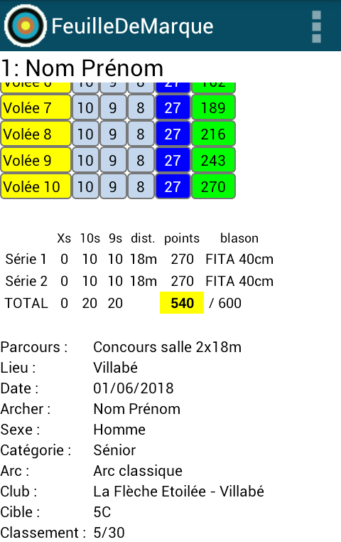L'application "Feuille de Marque" fonctionne sous Android et permet de sauvegarder ses scores au tir à l'arc sur cible (salle, fédéral, FITA). Elle est en particulier destinée aux membres du club La Flèche Etoilée, mais peut être utilisée par toute autre personne intéressée. Cette application n'est pas gérée par le club mais par l'un de ses adhérents. Elle n'est pas présente dans le store. L'installation se fait à partir du fichier apk à télécharger par le lien ci-dessus. L'utilisateur devra autoriser l'installation depuis des sources inconnues. Bien que cette application soit à usage totalement gratuit et sans publicité, il est demandé de rentrer une clé à la première utilisation. Cette clé débloque toutes les fonctionnalités. Elle s'obtient directement par e-mail en utilisant le formulaire ci-dessous. L'adresse e-mail sera uniquement utilisée pour l'envoi de la clé, et ne sera pas diffusée à des tiers. L'auteur recevra néanmoins une copie du message à titre uniquement informatif. Aucune donnée n'est collectée lors de l'utilisation de l'application. L'application nécessite les droits d'accès à la carte SD uniquement pour le stockage des données propres à l'application (sous le dossier FeuilleDeMarque). Pour les version récentes d'Android l'accès à la carte SD doit être autorisé dans les paramètres du téléphone. L'usage de cette application reste sous votre responsabilité et l'auteur se dégage de tout éventuel dommage qu'elle pourrait causer. L'utilisation de l'application est personnelle et destinée exclusivement à un usage non-commercial. Elle est fournie en l'état et l'auteur ne peut pas garantir son bon fonctionnement pour toutes les configurations. En cas de changement de téléphone, un nouvelle clé est nécessaire. Si vous voulez récupérer vos données, il vous faudra transférer le dossier FeuilleDeMarque vers votre nouvel appareil. Attention, le fichier FeuilleDeMarque/reglages/cleActivation.fdm contient la clé propre à votre appareil. Il est donc préférable d'effectuer le transfert avant de générer la nouvelle clé. Lors de l'installation d'une nouvelle version de l'application, il n'est pas nécessaire de renouveler la clé. J'accepte les conditions ci-dessus Etape 1: Accepter les conditions Etape 2: Télécharger l'application (fichier apk) sur le téléphone Etape 3: Installer l'application (autoriser les sources inconnues) Etape 4: A partir d'Android 7, autoriser l'accès au stockage (Paramètres / Applications / FeuilleDeMarque / Autorisations / Stockage) Etape 5: Lancer l'application. Une clé d'activation vous sera demandée (voir ci-dessous). Vous pouvez utiliser le lien proposé dans l'application Etape 6: Demander la clé d'activation en remplissant le formulaire ci-dessous (ne pas oublier d'accepter les conditions) Id du téléphone (indiqué lors du lancement de l'application - respecter les minuscules/majuscules) e-mail (pour la réception de la clé) M'avertir par e-mail des mises à jour Etape 7: Entrer la clé dans l'application comme indiqué ci-dessous et valider Historique des versions