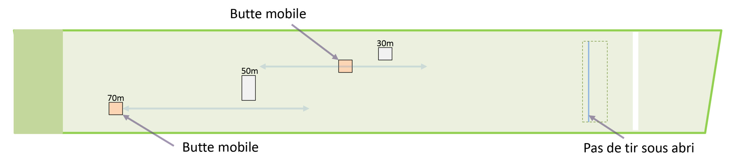 3 buttes de tir fixes et 2 buttes mobiles permettent des tirs échelonnés jusqu’à 70 mètres.